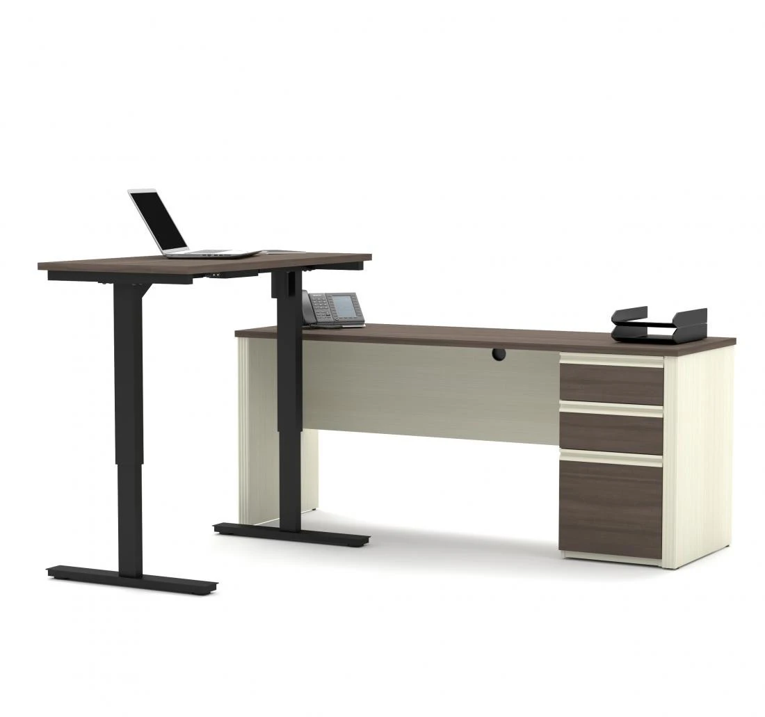 Bestar Prestige + 72W L-Shaped Standing Desk with Pedestal in White Chocolate & Antigua – 99885-52Â