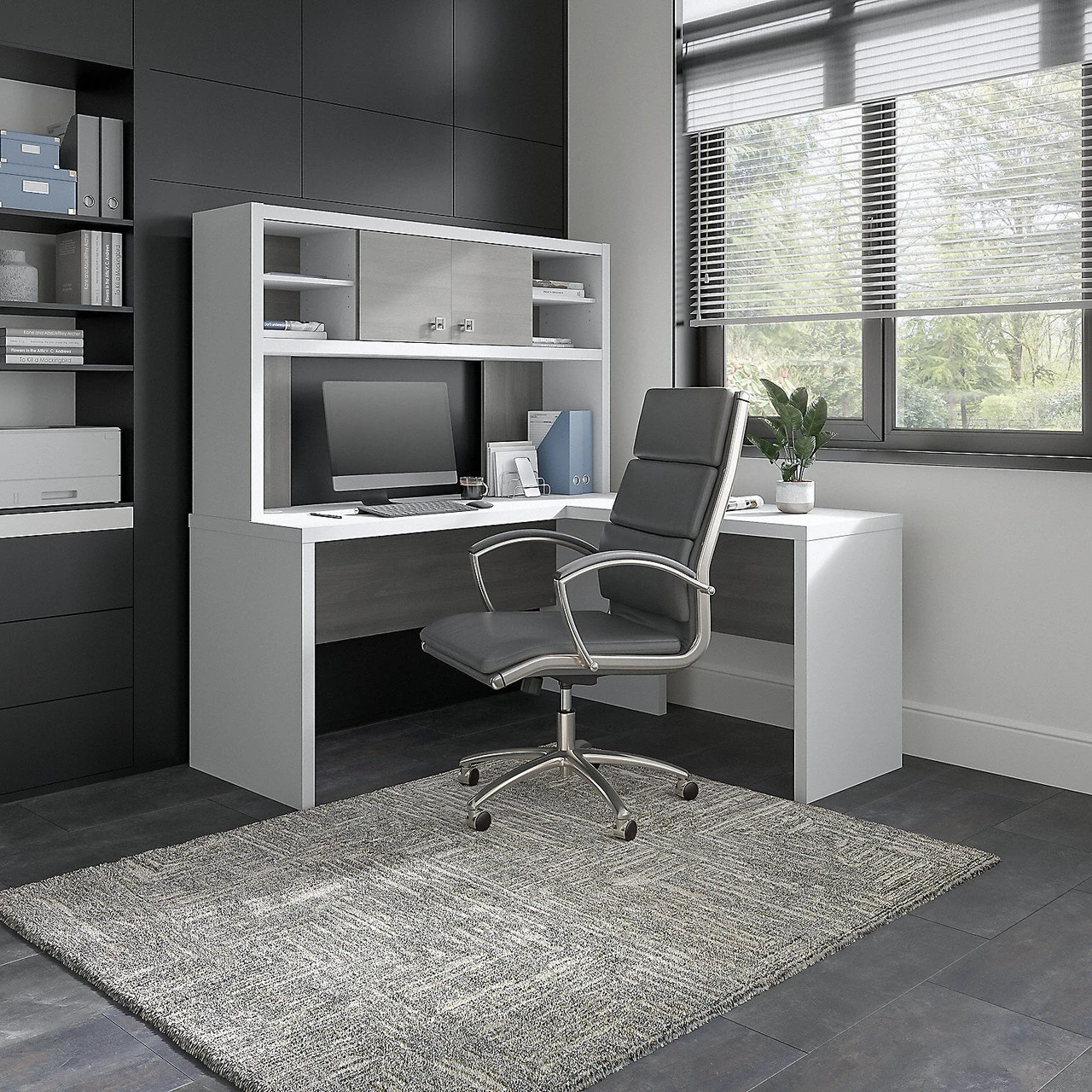 Bush Business Furniture Echo by Kathy Ireland L-Shaped Desk with Hutch White/Modern Gray – ECH031WHMG. The Office by kathy ireland® Echo L Shaped Desk with Hutch offers an elegant, functional design to inspire today’s professional. Wide lines and a thick surface create a strong presence while a thermally fused laminate finish protects the corner desk throughout years of everyday use.Â