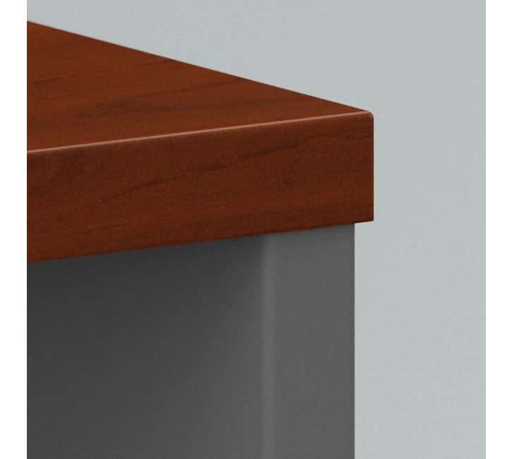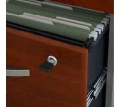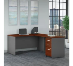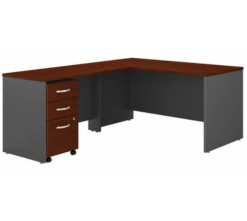 Bush Business Furniture Series C 60W L Shaped Desk with 3 Drawer Mobile File Cabinet in Hansen Cherry – SRC146HCSU. The Bush Business Furniture Series C 60W L Shaped Desk with 3 Drawer Mobile File Cabinet combines classic styling with the commercial quality construction needed to thrive in today’s work environments. Built to endure the rigors of a busy professional office, the durable thermally fused laminate surface and sturdy end panels protect the corner desk from normal wear and tear to preserve its appearance throughout years of everyday use. The desktop boasts a weight capacity of 200 pounds, allowing it to support multiple monitors and other materials while built-in wire management grommets keep cords and cables in order. Save space by placing the L Shaped Computer Desk in a corner or take advantage of the finished back to face any direction in a private or open-plan office. With its four dual-wheeled casters, the small filing cabinet is able to provide convenient storage anywhere in your office, including underneath the desktop. A single file drawer opens on smooth full-extension ball bearing slides for an easy reach to letter, legal and A4-size paperwork while two box drawers organize supplies. The two bottom drawers can be locked to secure sensitive documents and personal items. Find the perfect look to complement your workspace with four traditional finish options. This L Desk with File Cabinet is tested to meet ANSI/BIFMA standards for safety and performance and is backed by the Bush Business Furniture 10 Year Manufacturer’s Warranty. American made with U.S. and imported parts.