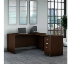 Bush Business Furniture Series C 60W L Shaped Desk with 3 Drawer Mobile File Cabinet in Mocha Cherry – SRC146MRSU. The Bush Business Furniture Series C 60W L Shaped Desk with 3 Drawer Mobile File Cabinet combines classic styling with the commercial quality construction needed to thrive in today’s work environments. Built to endure the rigors of a busy professional office, the durable thermally fused laminate surface and sturdy end panels protect the corner desk from normal wear and tear to preserve its appearance throughout years of everyday use. The desktop boasts a weight capacity of 200 pounds, allowing it to support multiple monitors and other materials while built-in wire management grommets keep cords and cables in order. Save space by placing the L Shaped Computer Desk in a corner or take advantage of the finished back to face any direction in a private or open-plan office. With its four dual-wheeled casters, the small filing cabinet is able to provide convenient storage anywhere in your office, including underneath the desktop. A single file drawer opens on smooth full-extension ball bearing slides for an easy reach to letter, legal and A4-size paperwork while two box drawers organize supplies. The two bottom drawers can be locked to secure sensitive documents and personal items. Find the perfect look to complement your workspace with four traditional finish options. This L Desk with File Cabinet is tested to meet ANSI/BIFMA standards for safety and performance and is backed by the Bush Business Furniture 10 Year Manufacturer’s Warranty. American made with U.S. and imported parts.