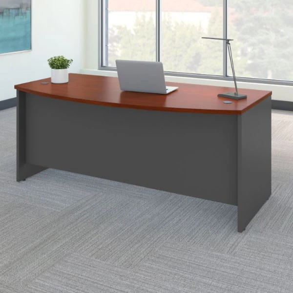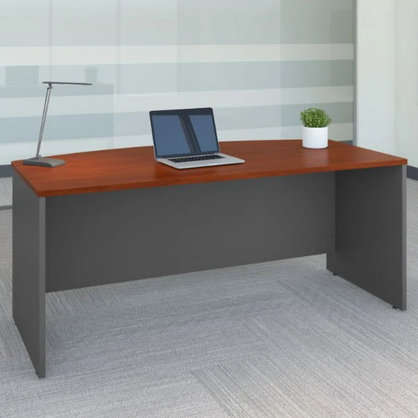 Bush Business Furniture Series C Bow Front Desk in Hansen Cherry 72″W x 36″D – WC24464 The options are endless with Series C. Backed by a 10 Year Warranty, the collection withstands the rigors of a 40-plus hour week. Multiple layout options and 7 finishes meet the needs of numerous workspaces. Series C evolves with your preferences, allowing you to reconfigure your office as required with a complete line of coordinated products. American Made with US and Imported Parts.