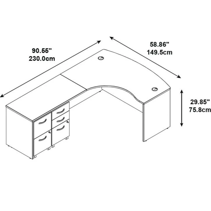 * Left Hand L-Bow Desk Shell: 58 7/8 W X 42 7/8 D X 29 3/4 H, Weight 132 lbs.