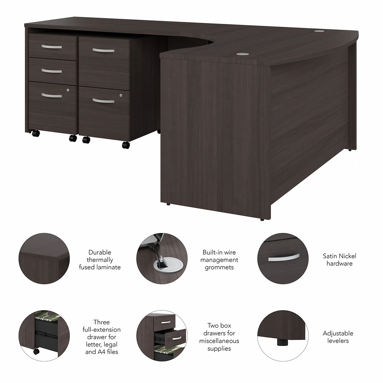 *Â Bundle includes: 60W x 43D Left Hand L-Bow Desk Shell, 48W Return, 3 Drawer Mobile File Cabinet