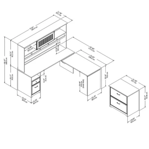 Bundle includes: 72W Computer Desk with Drawers, 42W Sit to Stand Desk Return with Lift-n-Lock Desktop, 72W Hutch, 2 Drawer Lateral File Cabinet