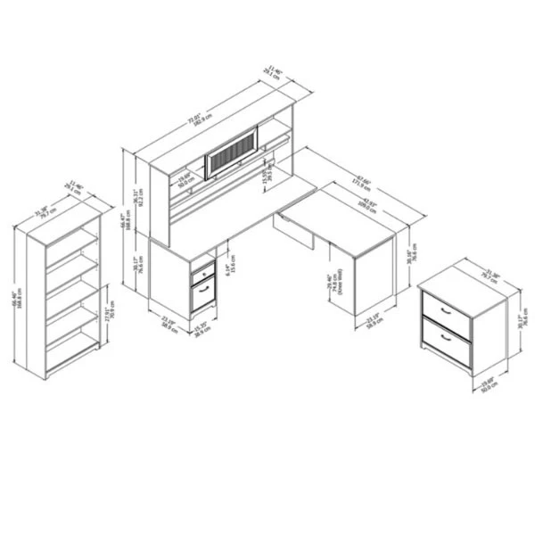Bundle includes: 72W Computer Desk with Drawers, 42W Sit to Stand Desk Return with Lift-n-Lock Desktop, 72W Hutch, 2 Drawer Lateral File Cabinet, 5 Shelf Bookcase