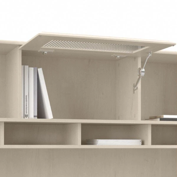 * Closed storage compartment on Hutch with fluted glass door that flips up to open