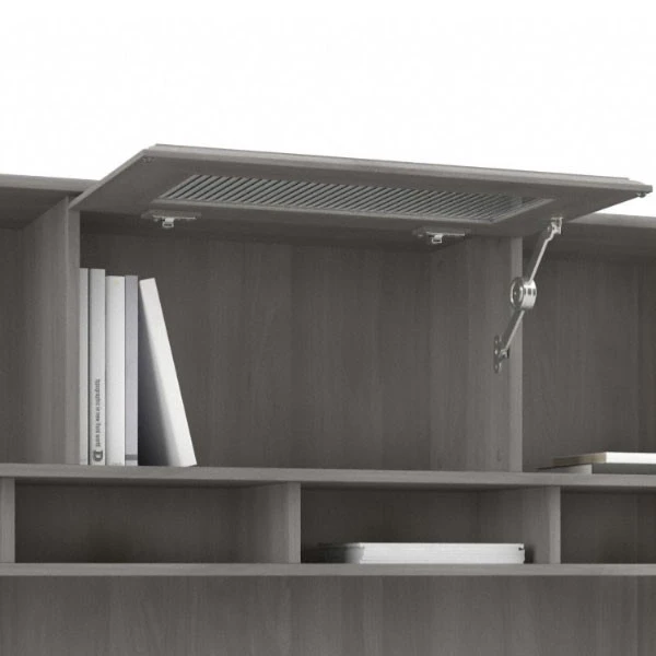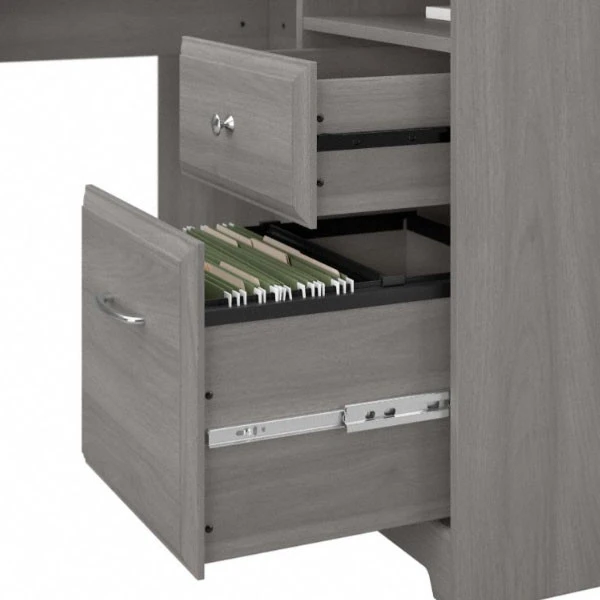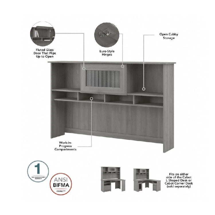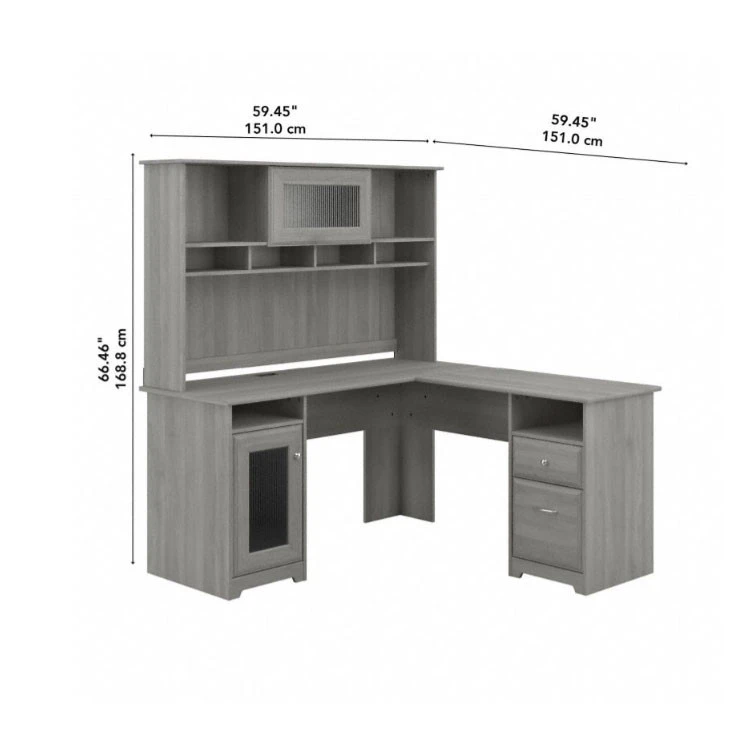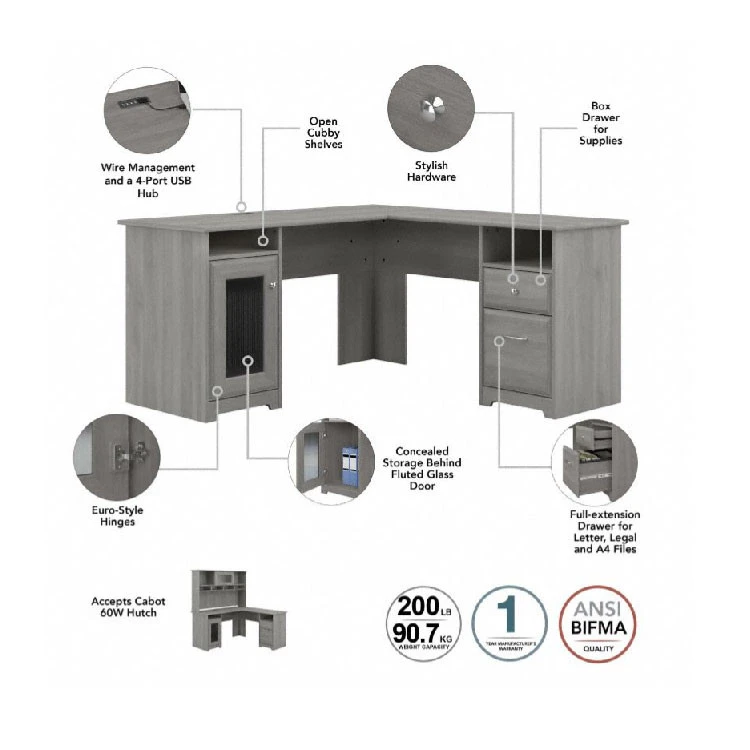Bush Cabot Collection 60 L-Shaped Desk with Hutch – CAB001MG. Simple, elegant styling, ample storage and smart technology integration features make Cabot a perfect fit for the home office.