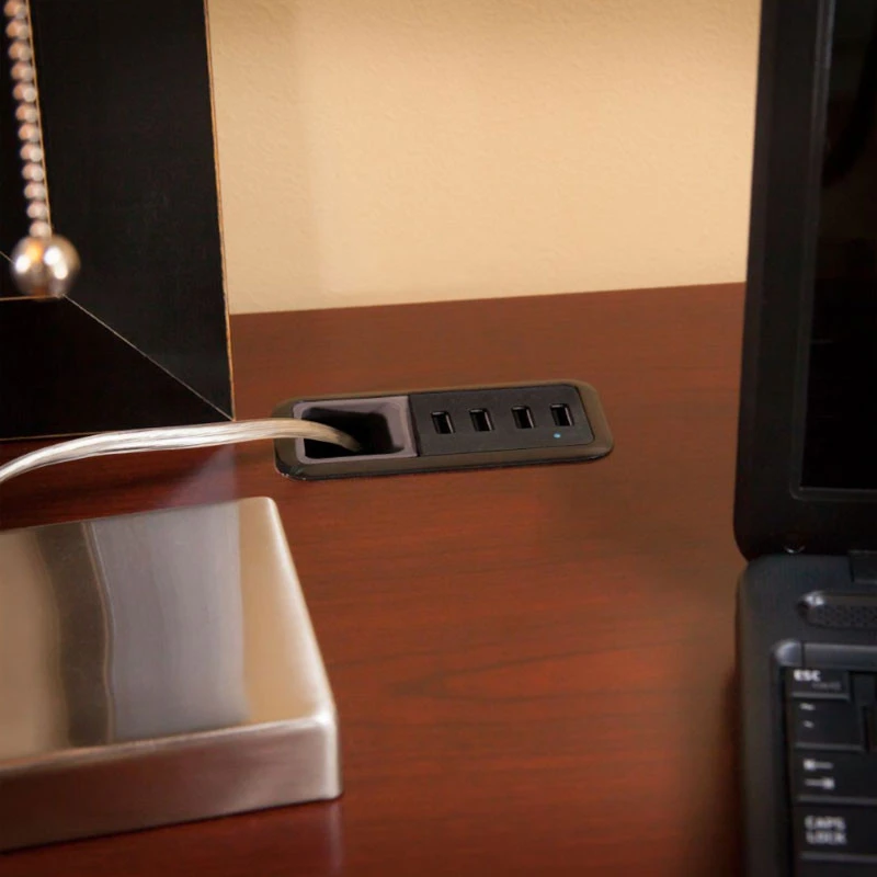 *Â The Harvest Cherry and Espresso Oak Desks contain a handy charging station; the Heather Gray Desk features a full shelf for paperwork and supplies