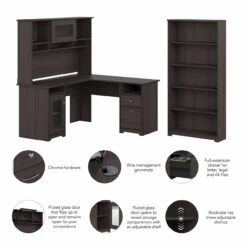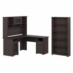Bush Cabot Collection L-Shaped Desk Package Heather Gray – CAB011HRG. Work in style with the Bush Furniture Cabot L Shaped Desk with Hutch and 5 Shelf Bookcase. Enjoy a beautiful traditional look with smart features for your convenience. Available in Espresso Oak, Harvest Cherry or Heather Gray, the beautiful office set features Chrome-finished hardware for a simple, elegant and timeless appearance.Â