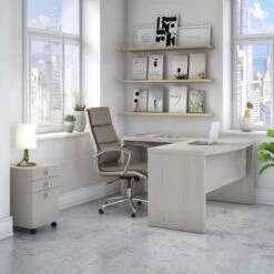 Bush Echo Bow Front Desk with 36″ Return and 3-Drawer Mobile Pedestal 60″ – ECH007GS. The Office by Kathy Ireland Echo creates a strong presence perfect for those whose passion for business is only matched by their fashionable tastes. Blending a Pure White finish with appealing wide lines, the contemporary furniture inspires and gives a residential feel to the modern workspace.