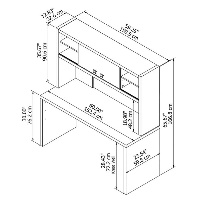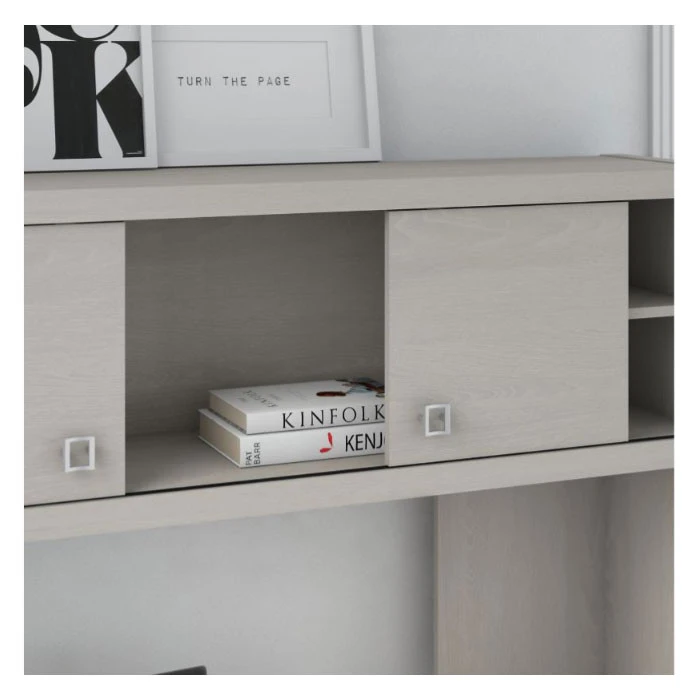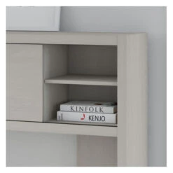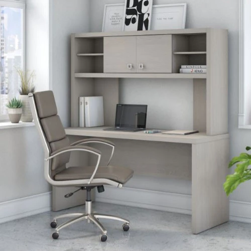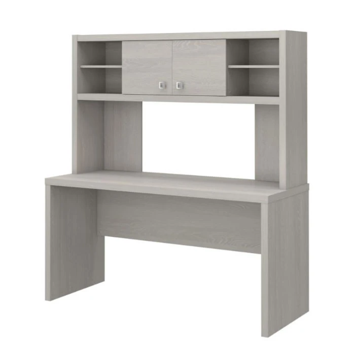 Bush Echo Credenza/Desk with Hutch – ECH030GS. The Office by Kathy Ireland Echo Credenza Desk offers an elegant, functional design to inspire today’s professional. Wide lines and a thick surface create a strong presence while a thermally fused laminate finish protects the white Desk throughout years of daily use.