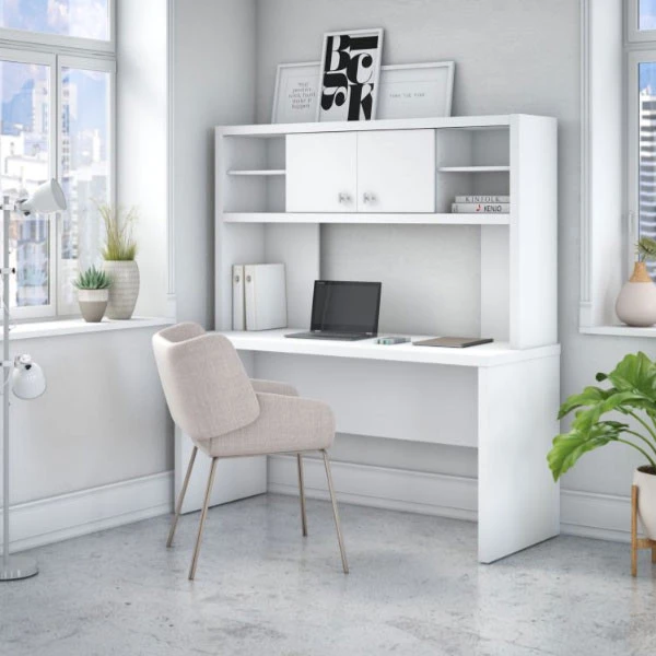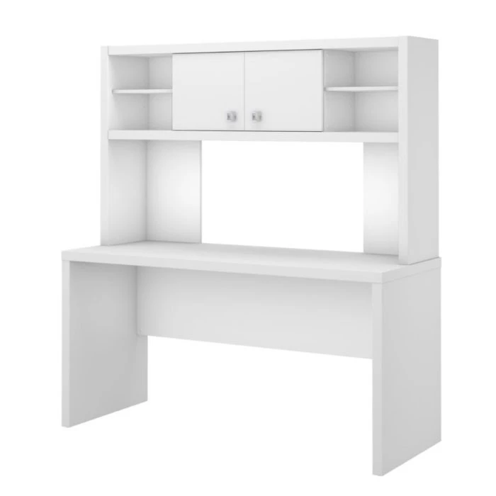 Bush Echo Credenza/Desk with Hutch – ECH030PW. The Office by Kathy Ireland Echo Credenza Desk offers an elegant, functional design to inspire today’s professional. Wide lines and a thick surface create a strong presence while a thermally fused laminate finish protects the white Desk throughout years of daily use.