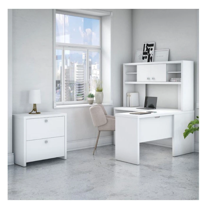 Bush Echo L-Shaped Desk with Hutch and Lateral File –Â ECH032PW. The Office by Kathy Ireland Echo creates a strong presence perfect for those whose passion for business is only matched by their fashionable tastes. Blending a Pure White finish with appealing wide lines, the contemporary furniture inspires and gives a residential feel to the modern workspace.