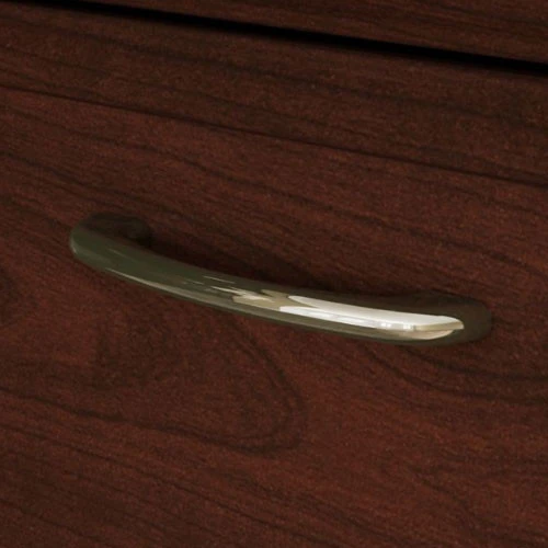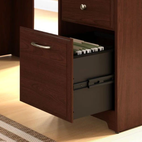 Turn any corner into a professional office with this Bush Furniture Cabot Corner Desk with Hutch and 5 Shelf Bookcase. The simple space-saving design provides everything you need for an attractive and functional home office. Corner Desk is reversible, includes a file drawer and an open cubby that’s perfect for a small printer, books or personal items. Available in Espresso Oak, Harvest Cherry or Heather Gray, the beautiful office set features Chrome-finished hardware for a simple, elegant and timeless appearance.Â