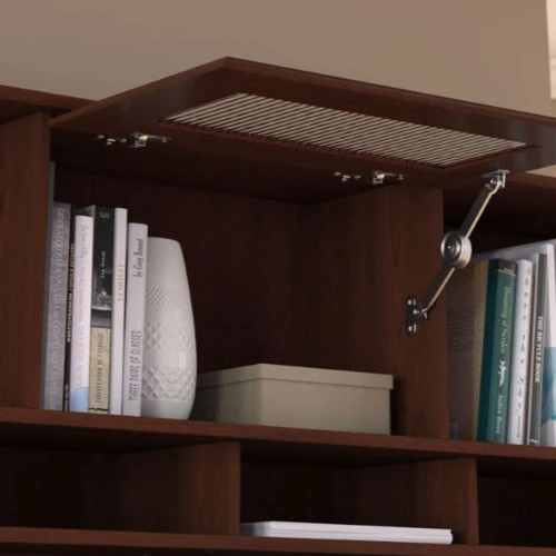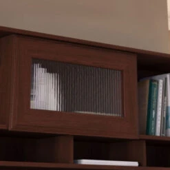*Â Closed storage compartment on Hutch with fluted glass door that flips up to open