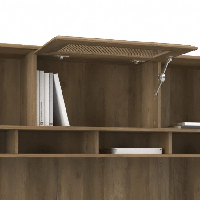 * Closed storage compartment on Hutch with fluted glass door that flips up to open