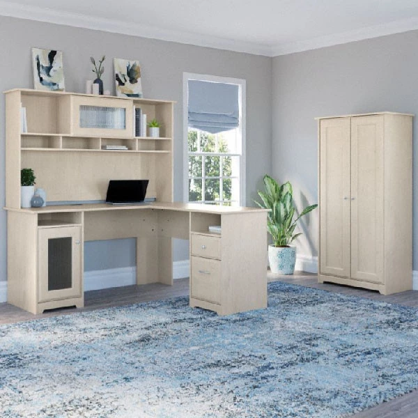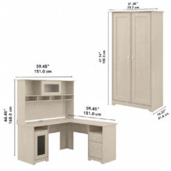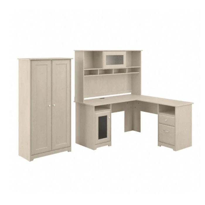 Bush Furniture Cabot Collection 60W L Shaped Computer Desk with Hutch and Tall Storage Cabinet Linen White Oak – CAB017LW.Â