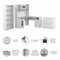 Bush Furniture Cabot Collection 60W L Shaped Computer Desk with Hutch, File Cabinet and Bookcase White – CAB010WHN