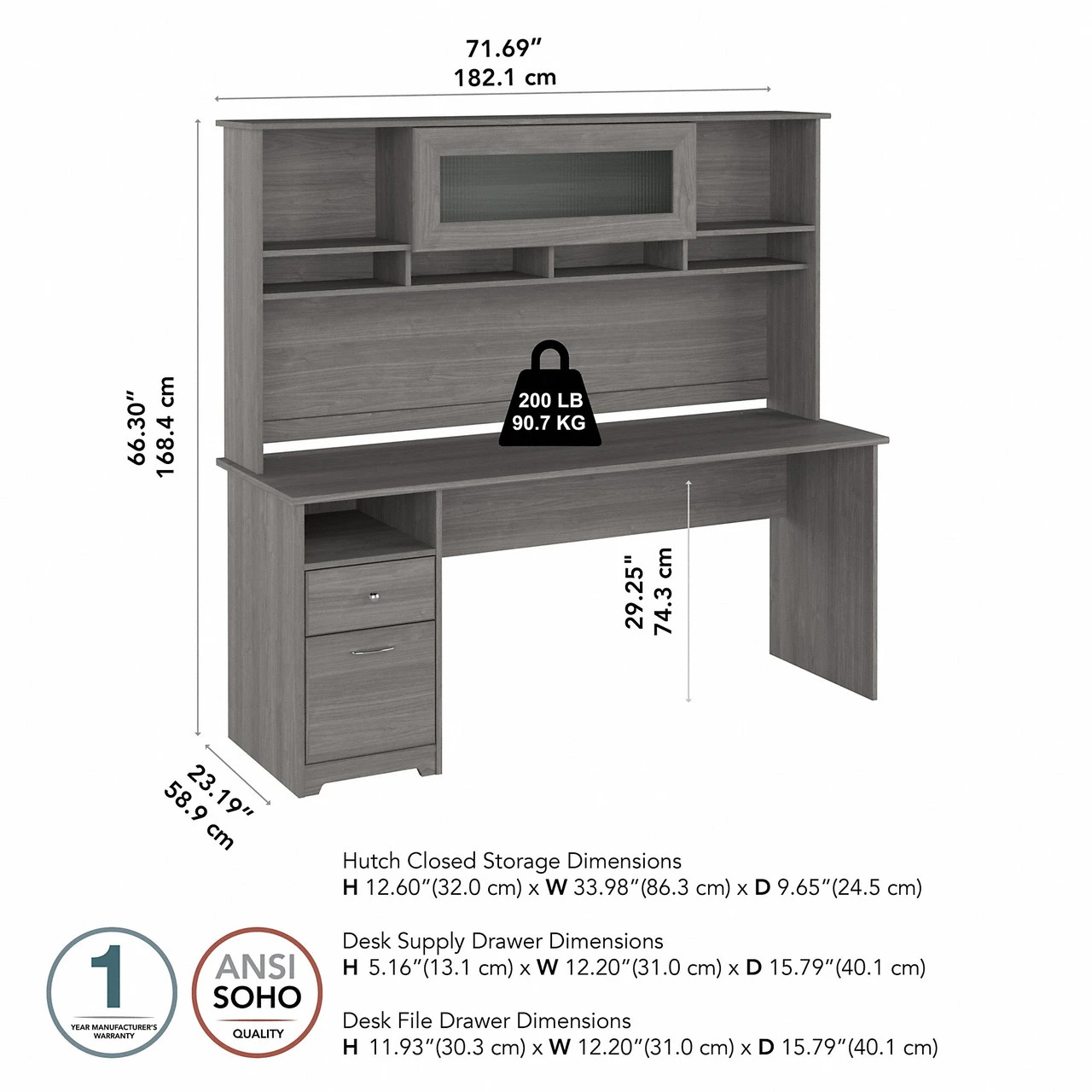 Bush Furniture Cabot Collection 72W Single Pedestal Desk and Hutch Modern Gray – CAB049MG
