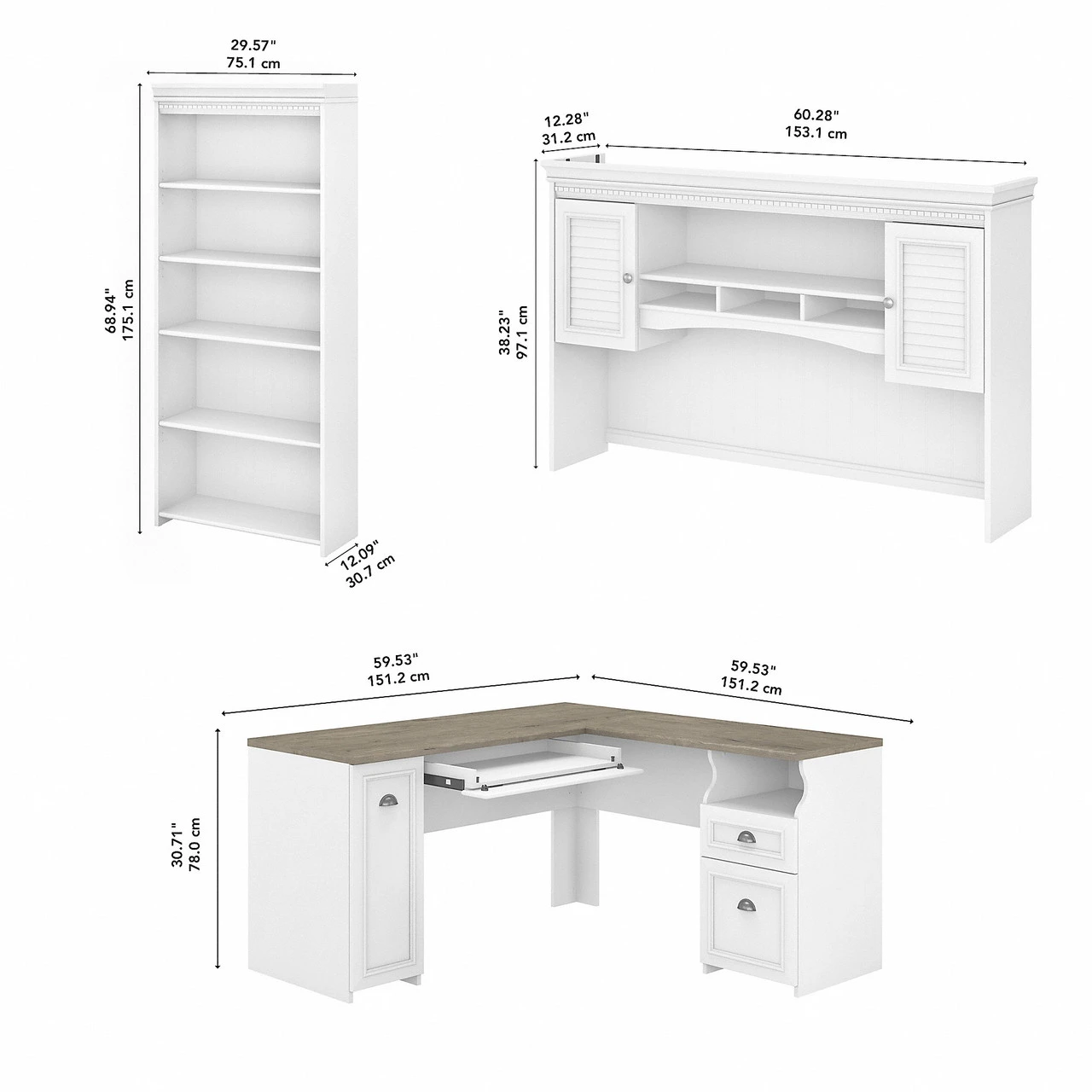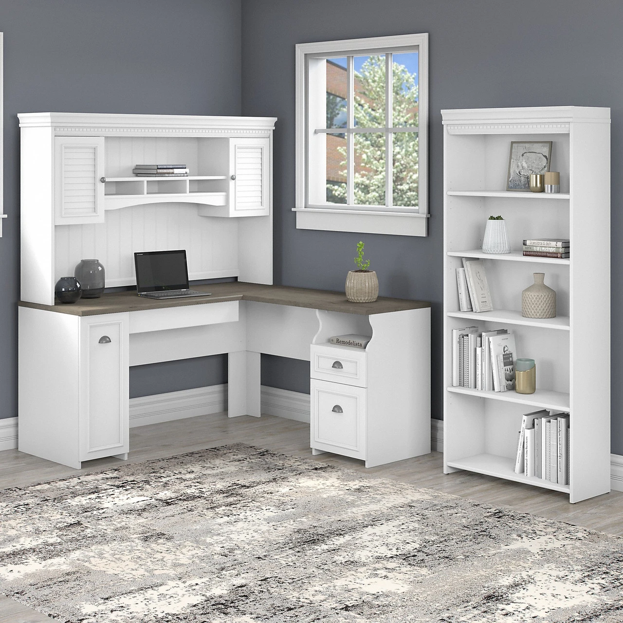 Bush Furniture Fairview 60W L Shaped Desk with Hutch and 5 Shelf Bookcase in Pure White and Shiplap Gray – FV005G2W