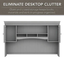 * Hutch offers two cabinets for concealed storage, a large open compartment for books and three smaller shelves for work-in-progress