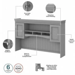 * Hutch includes closed storage with framed louvered doors, three work-in-process cubby shelves and large center shelf