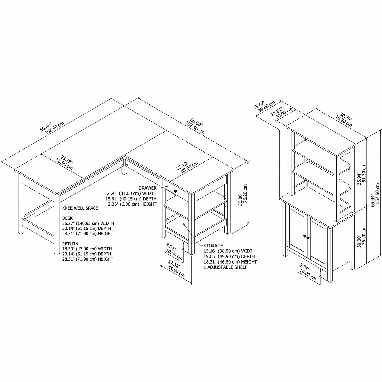 * Hutch adds one adjustable shelf and one fixed shelf for flexible storage; each shelf supports up to 25 pounds