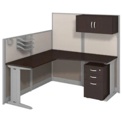 Bush Office-in-an-Hour L Shaped Desk Package Mocha – WC36494-03STGK. Each unit assembles in 60 minutes or less.