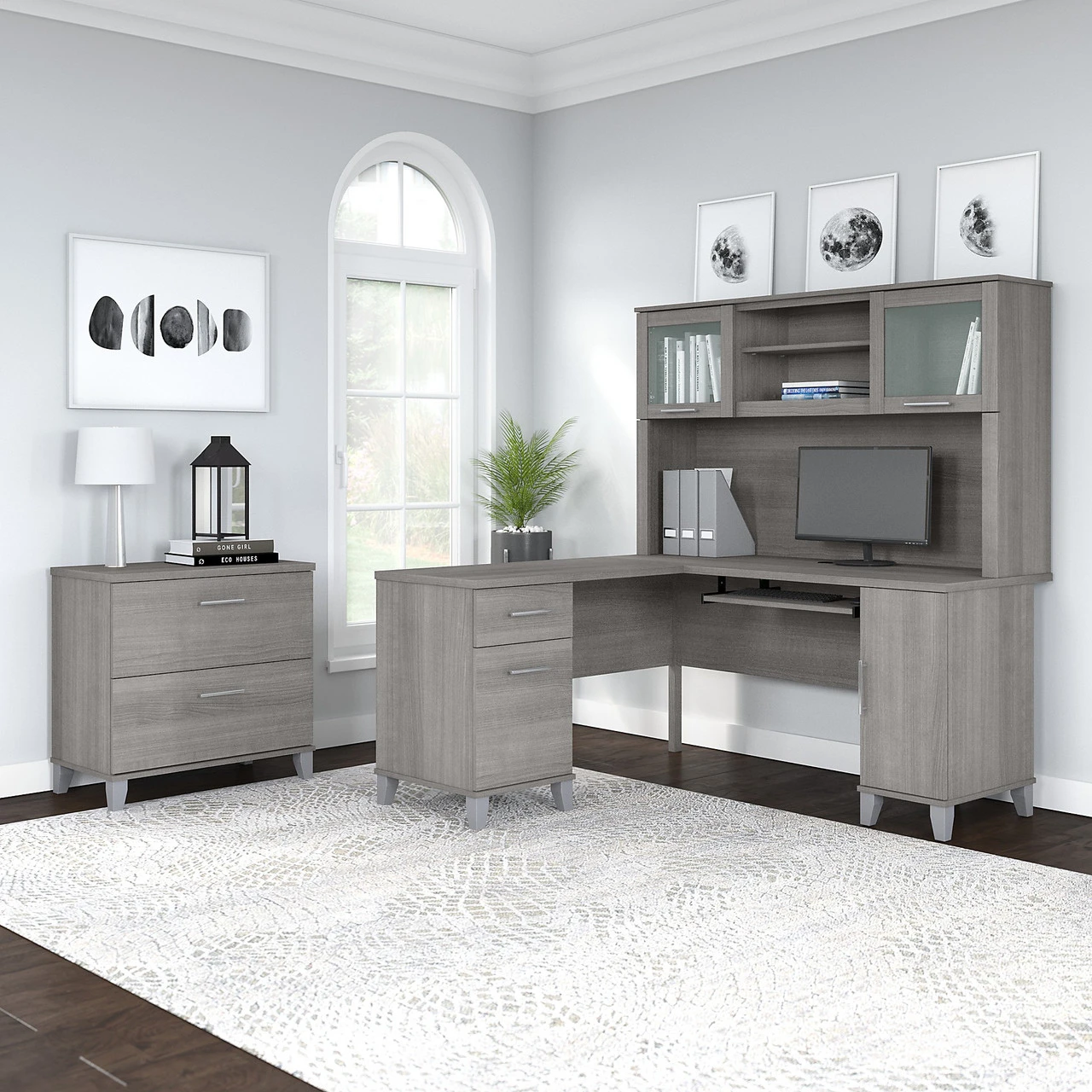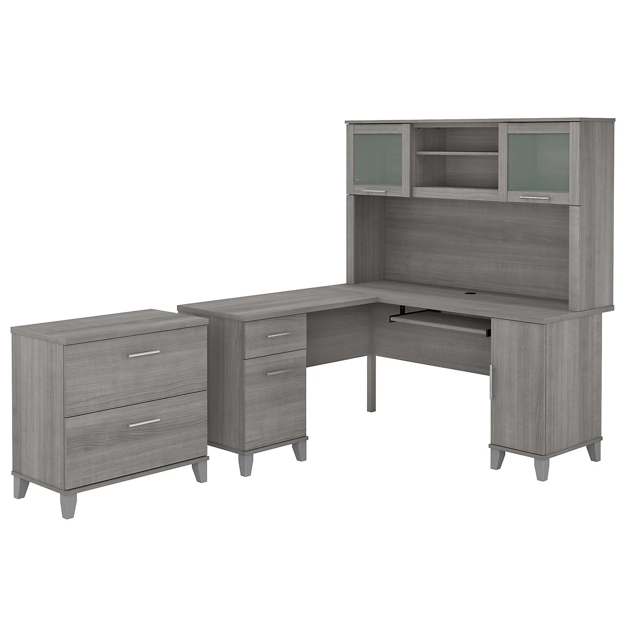 Bush Furniture Somerset 60W L Shaped Desk w Hutch w Lateral File Cabinet Platinum Gray – SET008PG