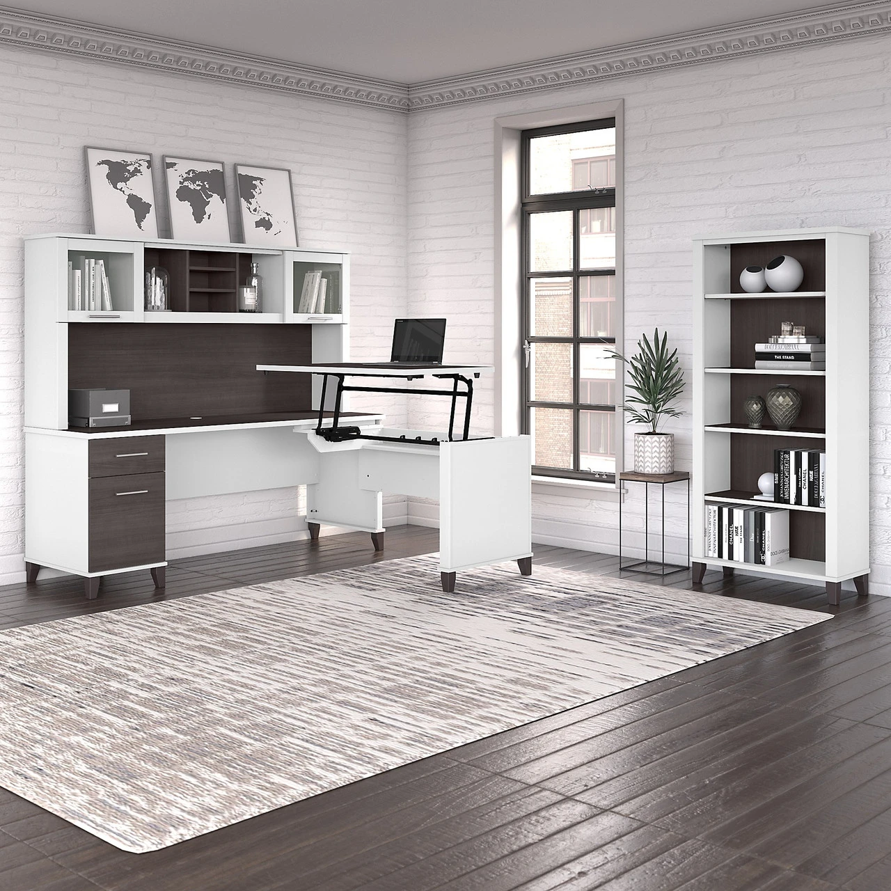 Bush Furniture Somerset 72W 3 Position Sit to Stand L Shaped Desk with Hutch and Bookcase in White and Storm Gray – SET017SGWH