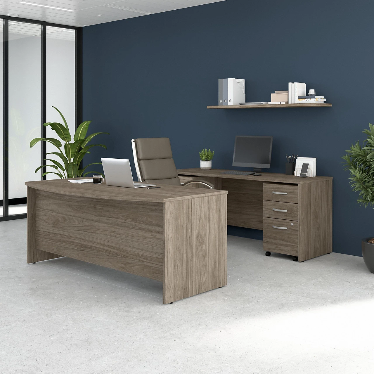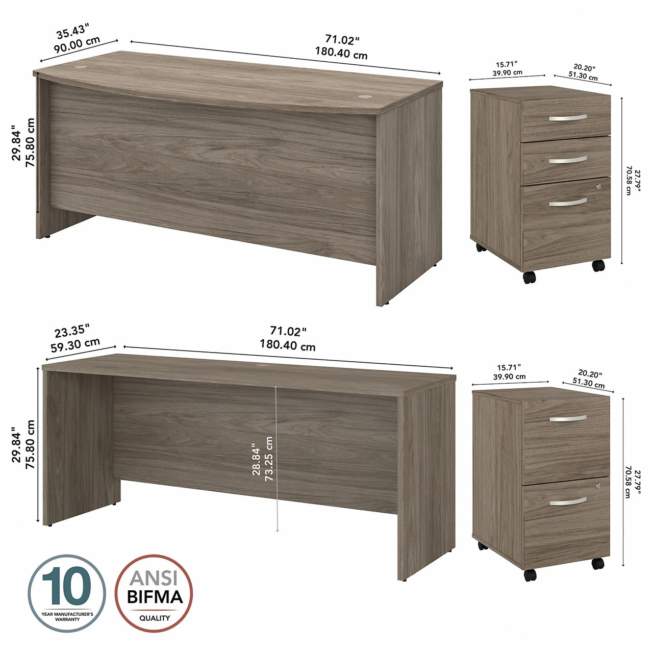 * Bundle includes: 72W x 36D Bow Front Desk, 72W x 24D Credenza Desk, 2 Drawer Mobile File Cabinet, 3 Drawer Mobile File Cabinet