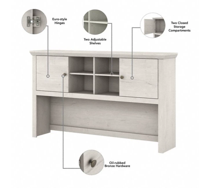 * Built-in file drawer and box drawer provide easy access to letter-size documents and small office supplies**Hutch features four open cubbies with two adjustable shelves for *flexible storage and display capacity