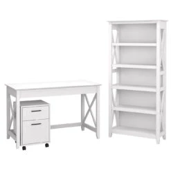 Bush Key West 48W Writing Desk With Mobile File Cabinet And 5 Shelf Bookcase Pure White Oak- KWS002WT.