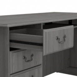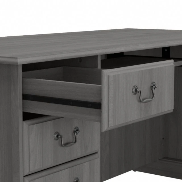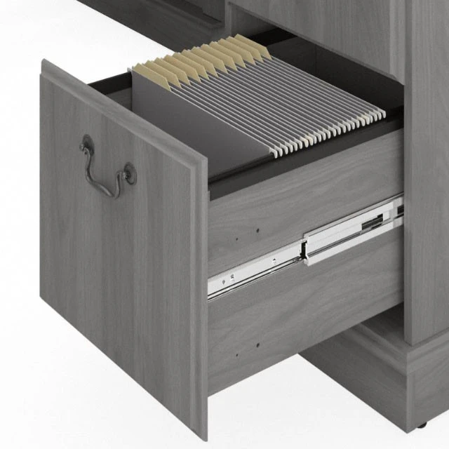 * Built-in storage includes three file drawers for letter, legal and A4-size paperwork and two box drawers for office supplies