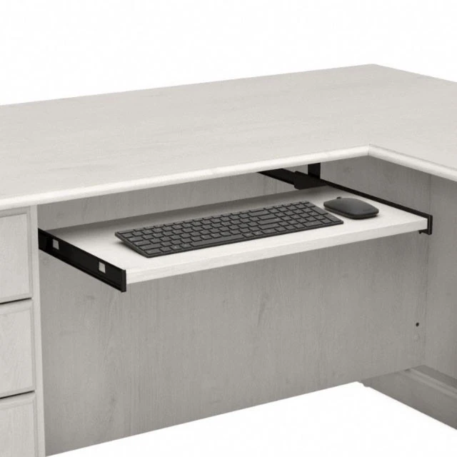 Retractable keyboard tray/laptop storage shelf keeps the work surface clutter free