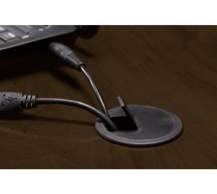 * Integrated wire management grommets organize cables and cords