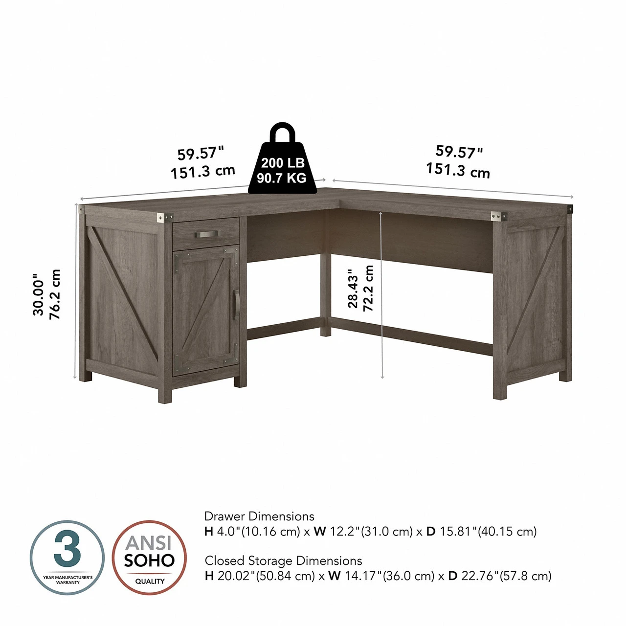 * L Desk’s box drawer and storage cabinet organize miscellaneous office supplies and reference materials