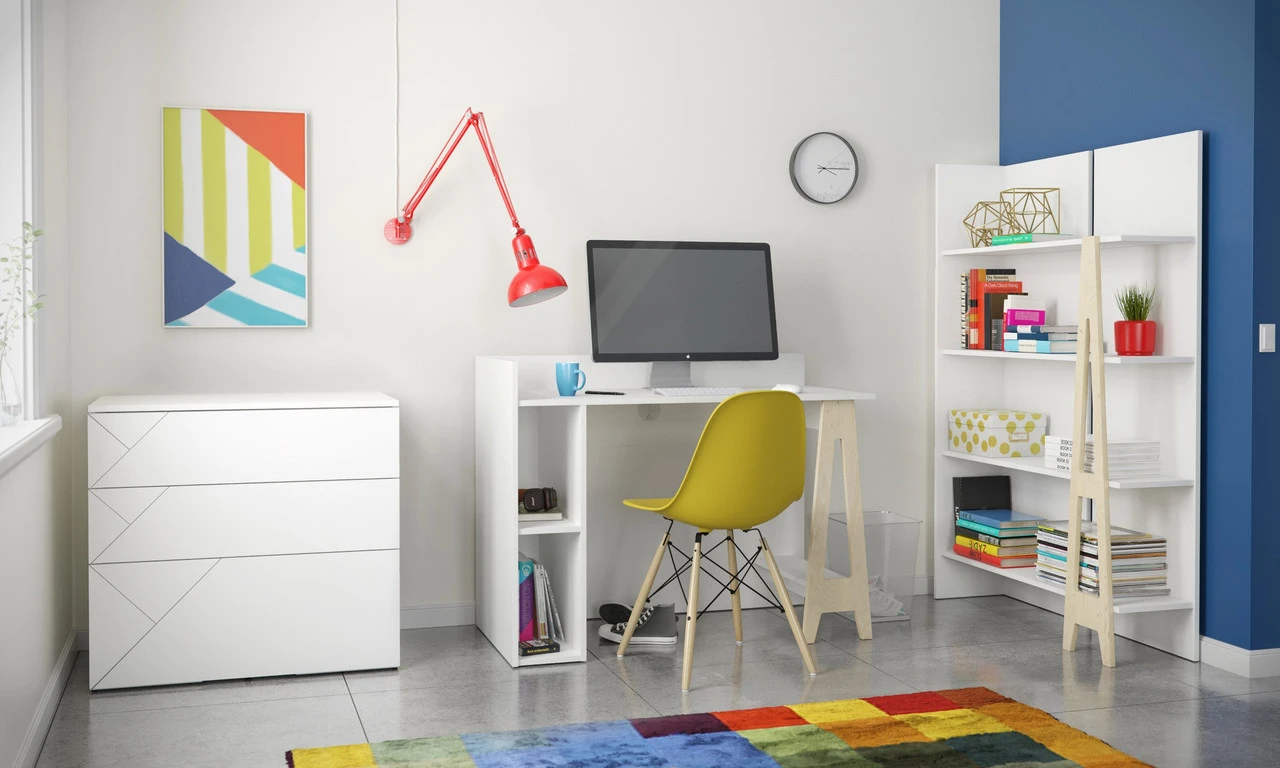 Nexera Atypik Open Storage Desk, White and Russian Plywood – 608003. Perfect for giving you the space you need to tackle your creative tasks, the Atypik desk is ideal as the centerpiece of your workspace with its unique look and the avant-garde detail of its “A” leg. For practical reasons, it has 2 open storage spaces, providing ample space to store and organize your personal belongings.